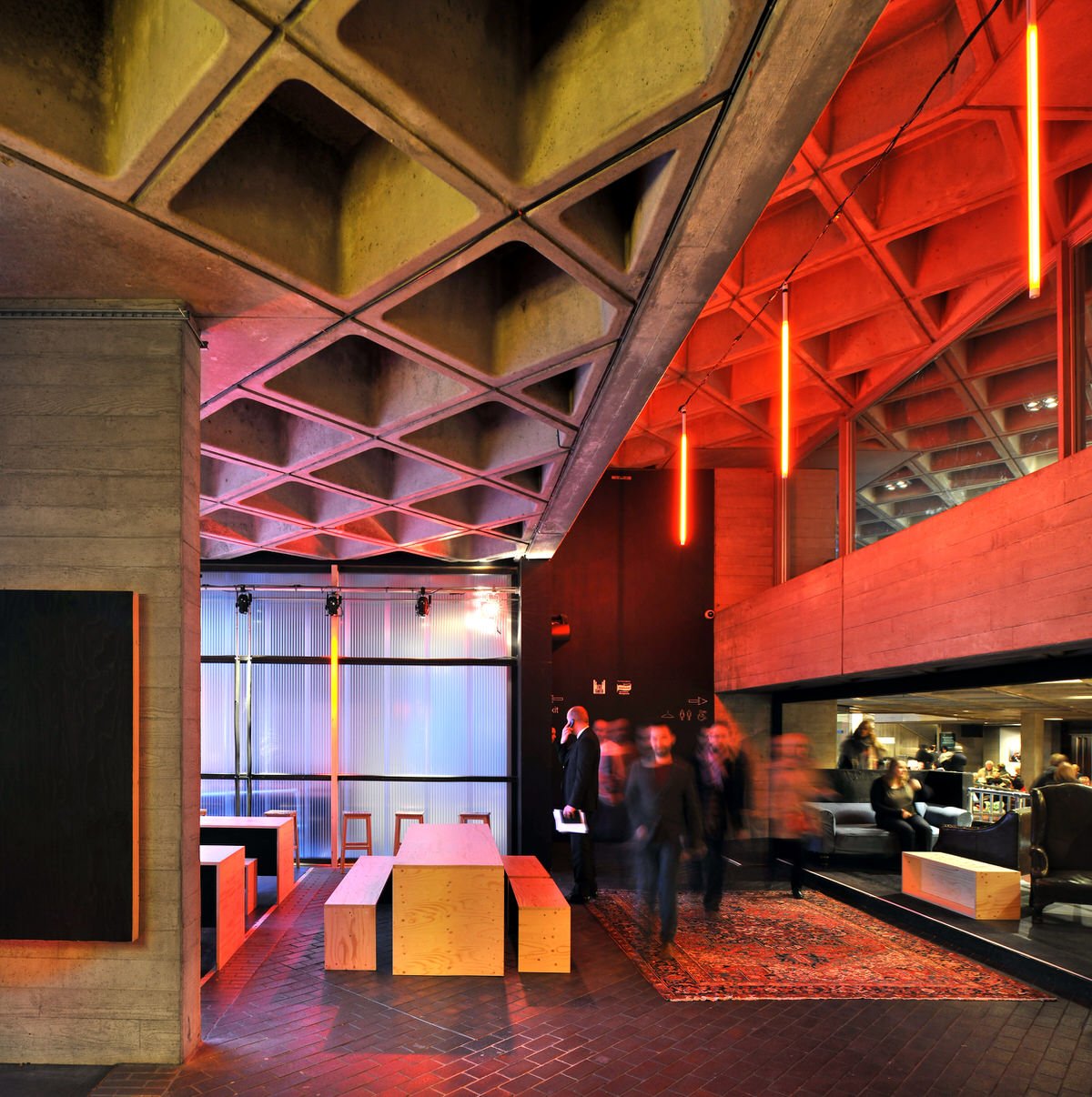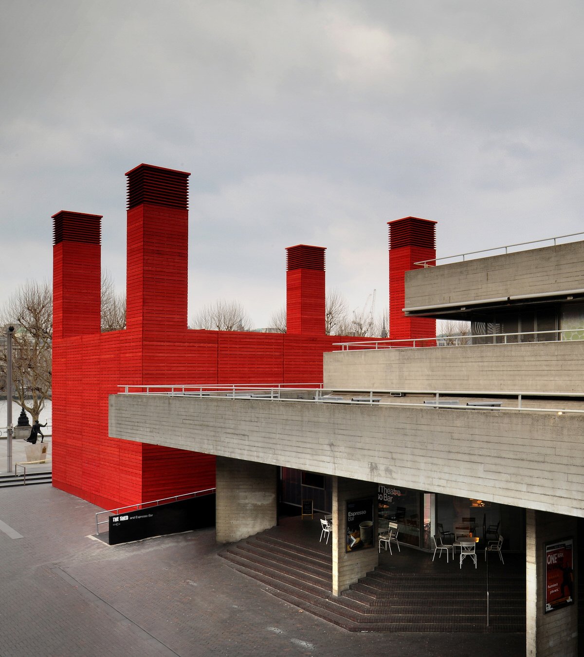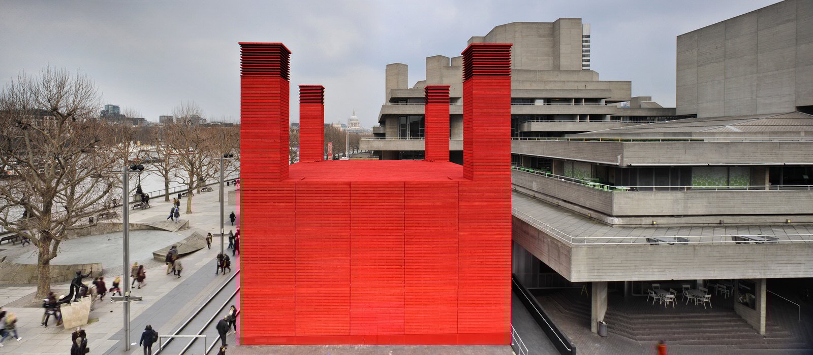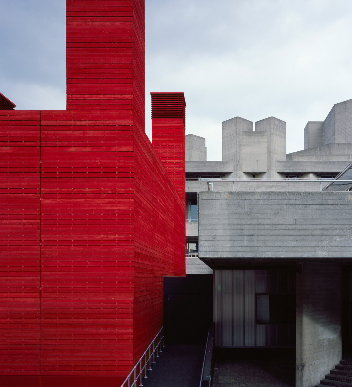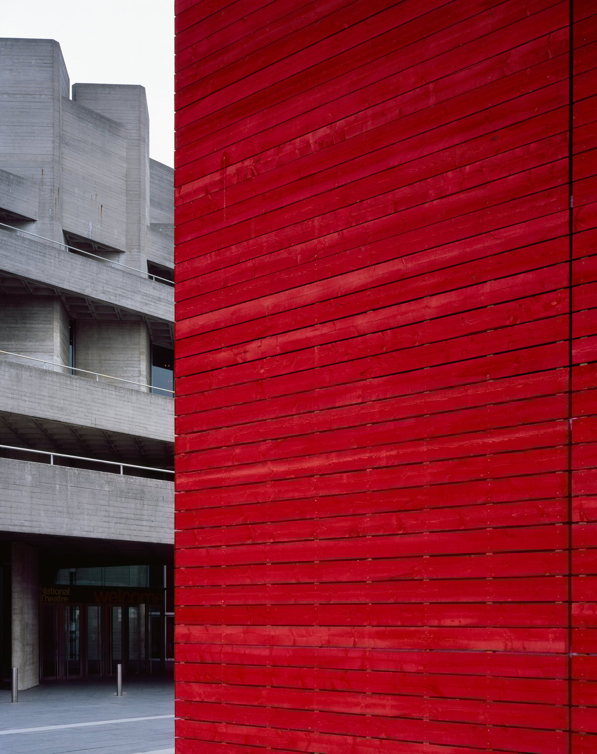 The brilliant red colour covering the entire mass of a form without doors or windows boldly announced the venue against the geometric concrete forms of the NT, giving it a startling and enigmatic sculptural presence.