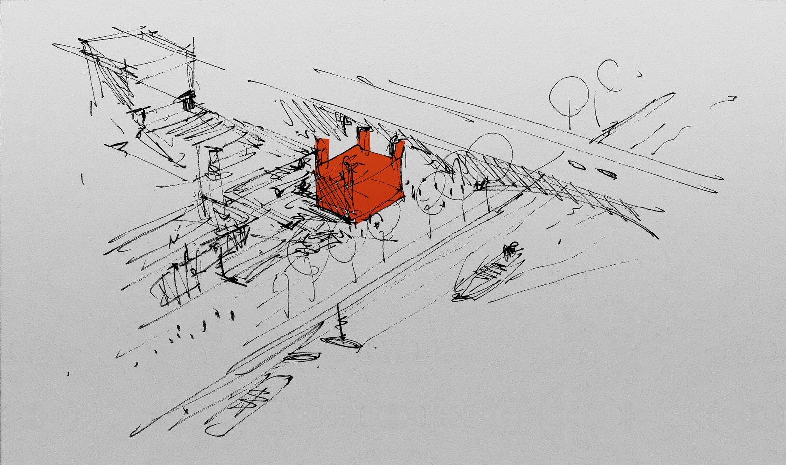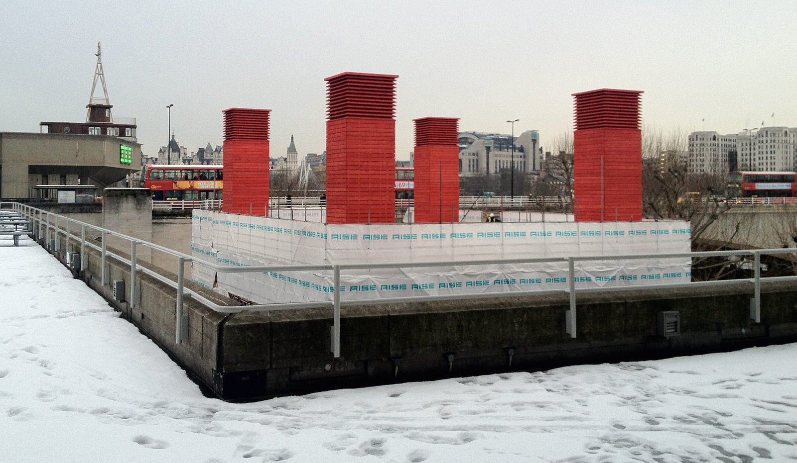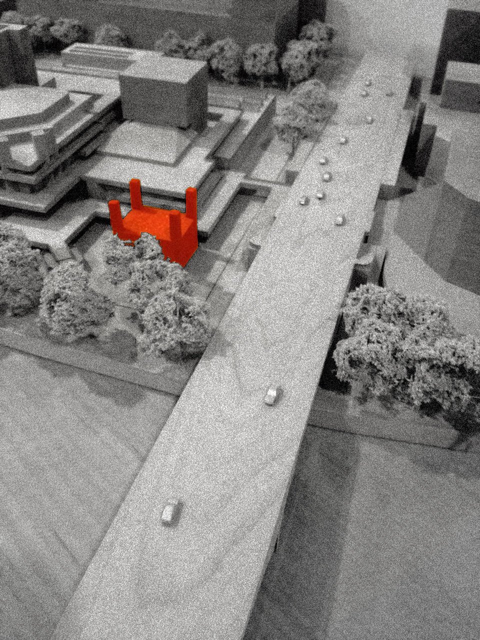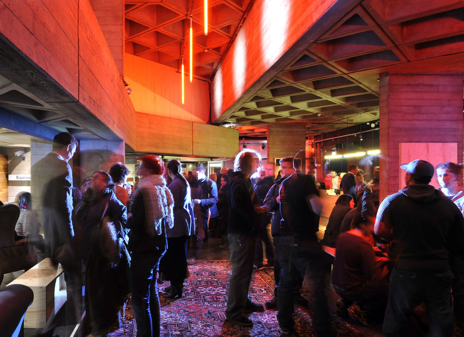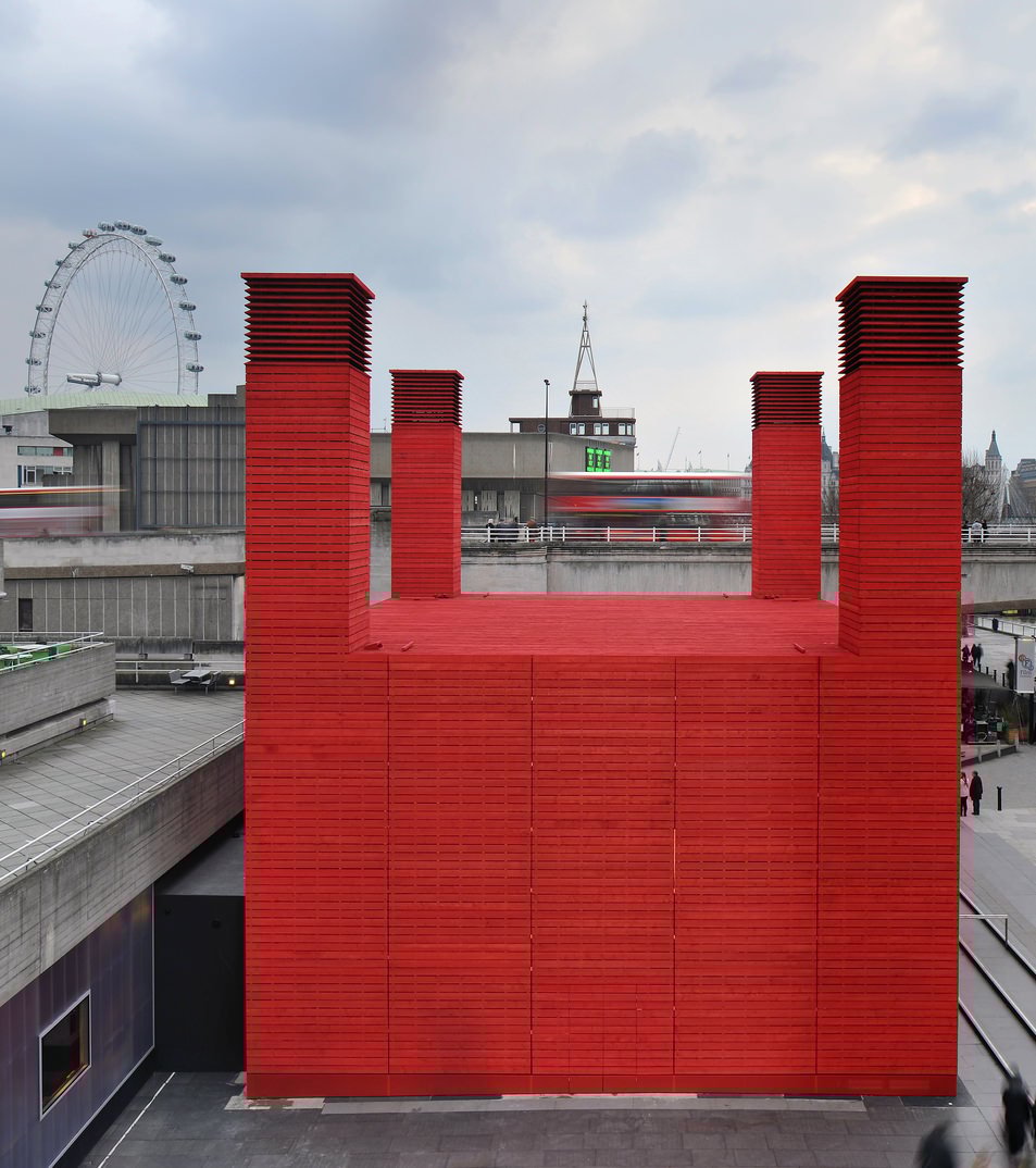 The brilliant red colour covering the entire mass of a form without doors or windows boldly announced the venue against the geometric concrete forms of the NT, giving it a startling and enigmatic sculptural presence.