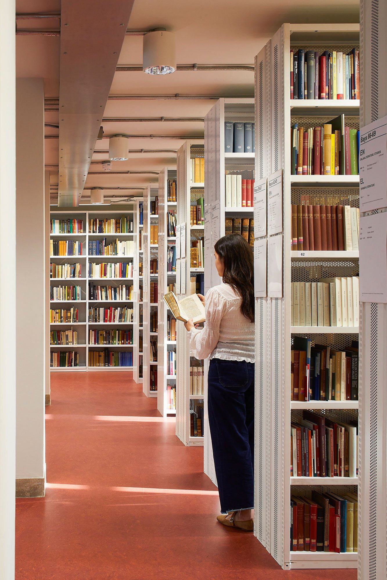 In the main reading room, a much-loved space, existing shelving designed by Charles Holden has been retained, with the refurbishment providing new finishes, lighting, seating and controlled access to the library stacks.