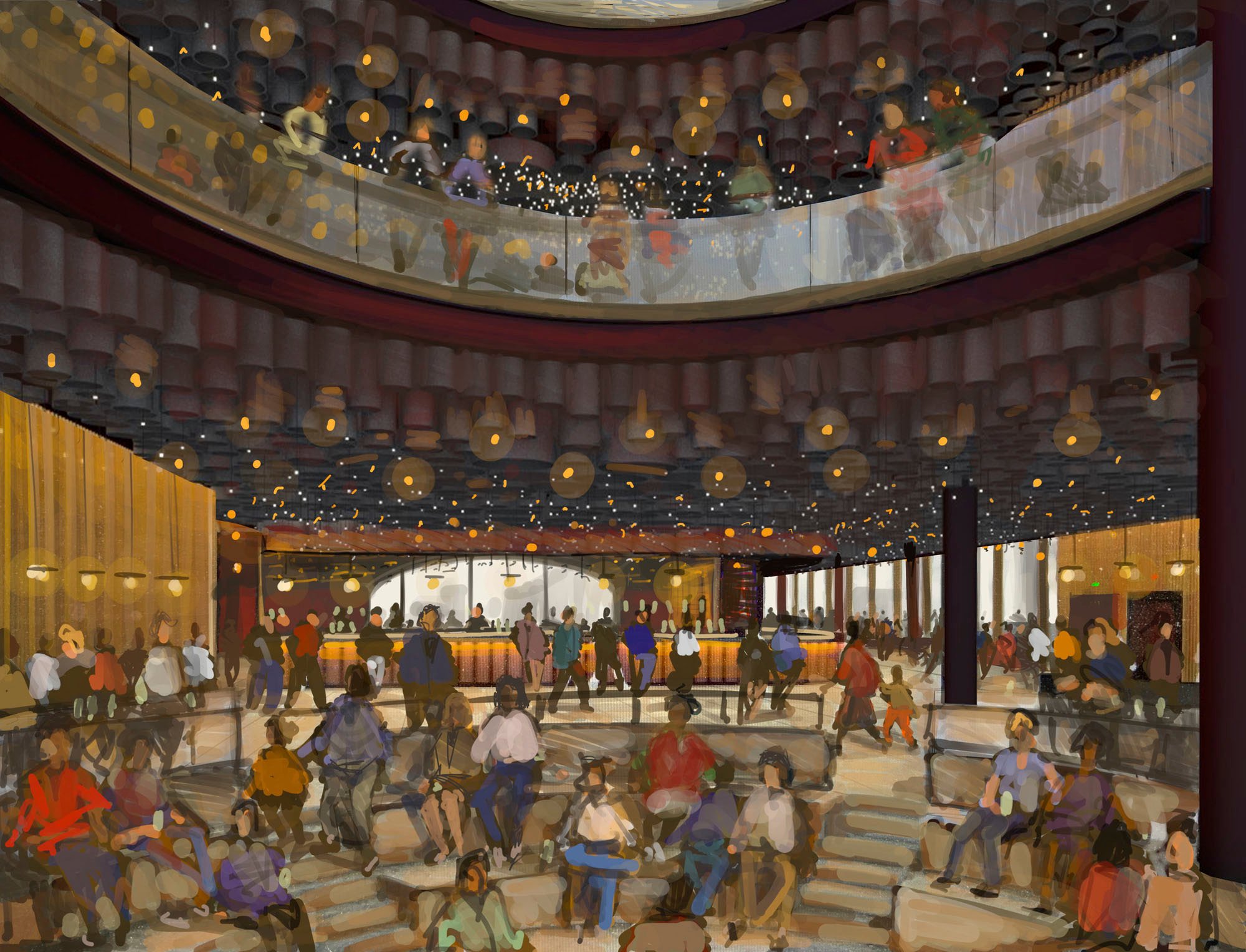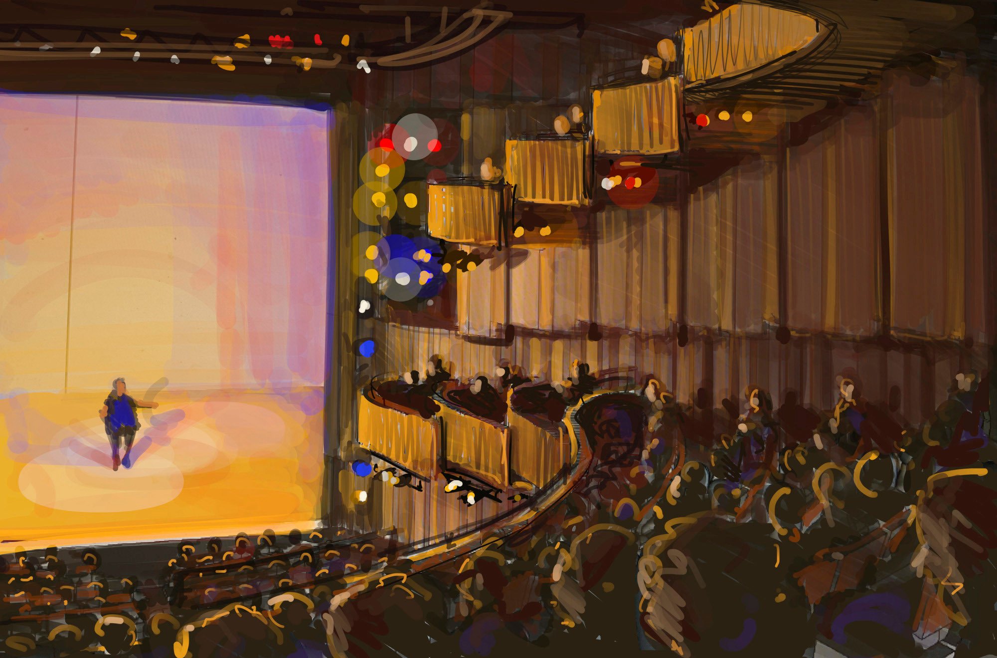 Our proposals include extensive bar and foyer spaces spread across five floor levels around a central atrium void, with horseshoe balustrades overlooking the lower levels and outward to the glazed façade. Back-of-house features spacious dressing rooms, and comprehensive technical areas. The auditorium is conceived as an intimate proscenium end-on theatre with three main seating levels contained within a sumptuous timber wall lining, treated in warm bronze tones.