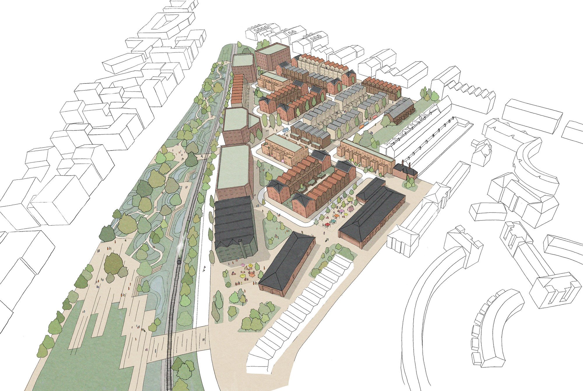 The project has been shaped by York’s character and heritage. Building forms, materials and street patterns take inspiration from the city’s Victorian terraced streets and industrial architecture. Along Central Park, apartment buildings and taller terraces create a strong, active frontage, while quieter residential streets and landscaped ginnels provide shared gardens and places for neighbours to meet.